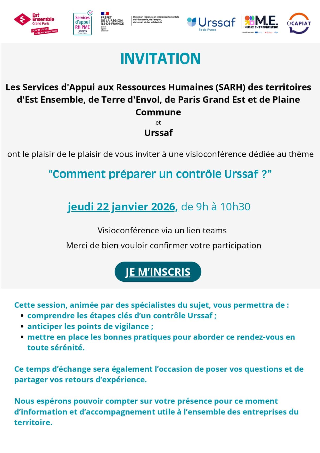 Mis en avantLes Services d'Appui aux Ressources Humaines (SARH) des territoires d'Est Ensemble, de Paris Terres d'Envol, de Grand Paris Grand Est, de Plaine Commune et l'Urssaf ont le plaisir de le plaisir de vous inviter à une visioconférence dédiée au thème : “Comment préparer un contrôle Urssaf ?" Cette visioconférence aura lieu le jeudi 22 janvier […]