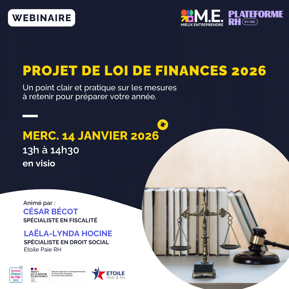 Mis en avantProjet de loi de finances 2026 Un point clair et pratique sur les mesures à retenir pour préparer votre année. Ce webinaire vous sera présenté par César Bécot, spécialiste en fiscalité, et Laëla-Lynda Hocine de Etoile Paie RH, experte en droit social. Infos pratiques : Mercredi 14 janvier 2026 13h – 14h30 en visio, […]