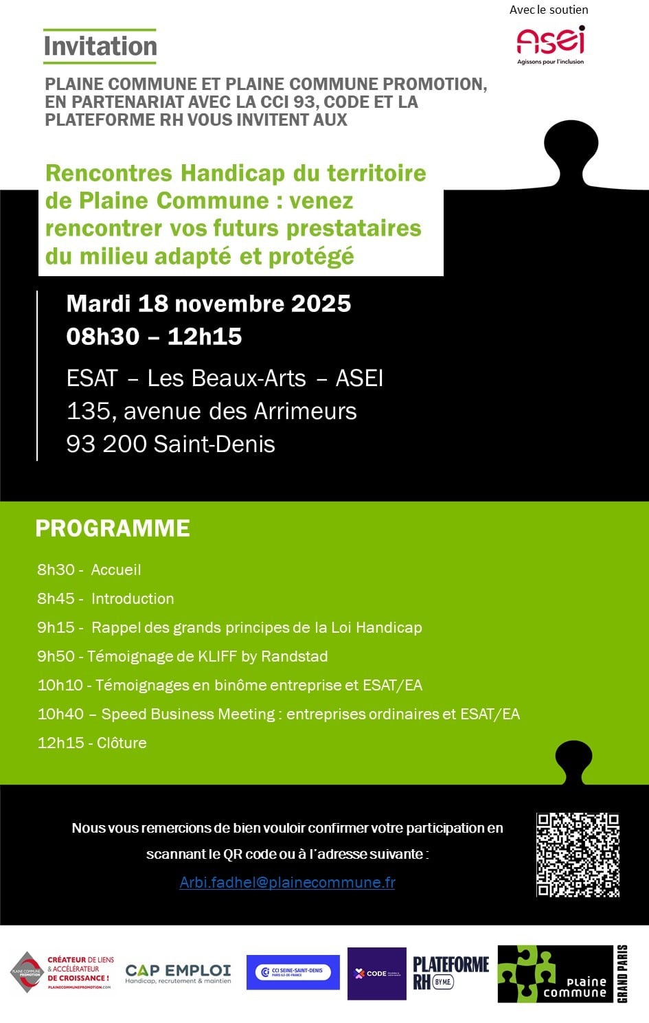 ESAT - Les Beaux-Arts - ASEI 135, avenue des Arrimeurs, Saint-DenisDans le cadre de la Semaine européenne pour l’emploi des personnes handicapées, Plaine Commune et ses partenaires, vous invitent à un Speed Meeting Business. Au programme, venez rencontrer les ESAT […]
