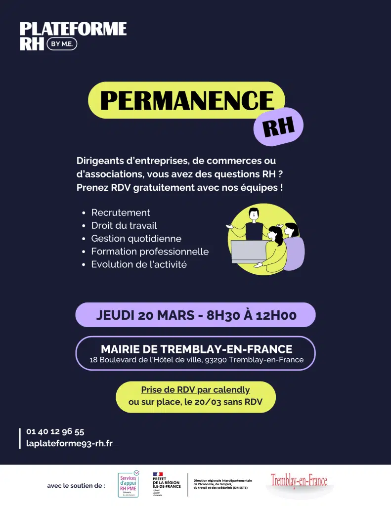 La Plateforme RH est présente à la Mairie de Tremblay-en-France tous les 3ème jeudis du mois.